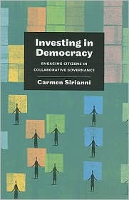 One of my primary research interests is the emerging practice of collaborative governance. I  have recently blogged about some of my own research on the topic and am happy here to recommend an excellent book I have recently read. Professor Carmen Sirianni (Brandeis University) recently published Investing in Democracy: Engaging Citizens in Collaborative Governance (2009, Brookings Institution Press), an engaging book that captures the many interweaving facets of collaborative governance and brings the concepts to life with three richly drawn case studies. This book will be of interest to a wide variety of people, including community development practitioners.