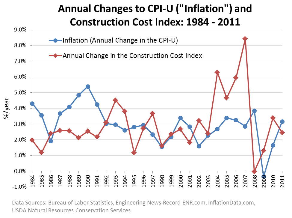 Over the past decade, the Consumer Price Index has been more stable than the Construction Cost Index, with annual increases generally between 1 and 4 percent (with the exception of a negative change in 2009 during the recession). The Construction Cost Index in the same period has been a bit more volatile, with increases as high as 8.5 percent in 2007 and as low as 0 percent in 2008 (looking at a chart of the price changes, the ramp up of housing prices and the subsequent bubble burst are evident).