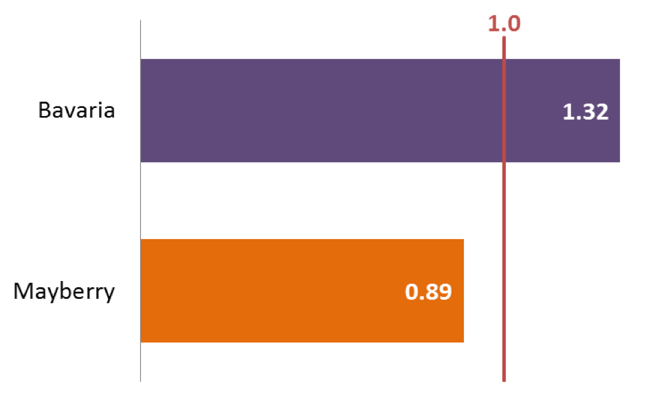 Since in our previous post we saw that Mayberry failed to reach targets for operating ratio as well, this may be an indication that the system’s rates are too low. Certainly, very few if any lenders would be willing to loan money to the system until their debt service coverage ratio improves. Even Bavaria may want to consider a rate increase based on these numbers. While they are meeting minimum standards, they are still well below the median for many of their peers.