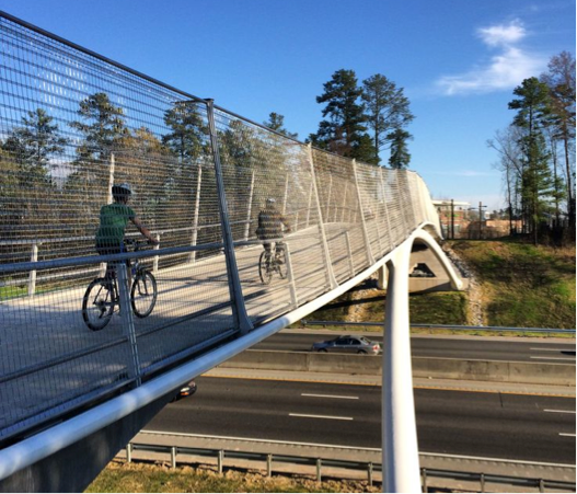 Within North Carolina, bridges have also had an important social impact. The Durham Freeway Bridge near Alston Avenue honors R. Kelly Bryant Jr.’s “long effort to reconnect black neighborhoods split by the highway.” The bridge crosses Interstate 40 and connects the American Tobacco Trail to The Streets at Southpoint. This gateway brings together communities and gives access to the outdoors as well as plentiful shopping options. Similarly, with the recent help of Creative Corridors Coalition, Winston-Salem is planning the Strollway Pedestrian Bridge to “relink the city’s historic past to its dynamic present and bright future.” Planting beds will be integrated into the bridge on either side of the walkway with a variety of native plants and ornamental trees. This bridge will represent a truly innovative transportation solution for Winston-Salem.