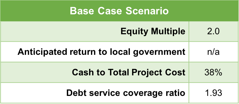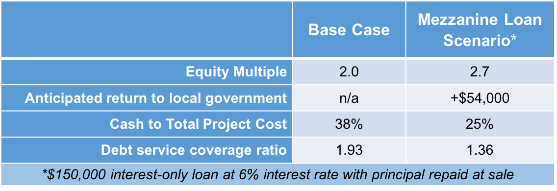 Yet by providing a mezzanine loan, the Town or another public institution could help make this investment more attractive by simultaneously decreasing the equity requirement and increasing returns. A mezzanine loan is subordinated debt with a higher interest-rate, meaning that the Town’s loan would only be repaid after the project first repaid the loan from the bank (a higher-risk position for the local government).