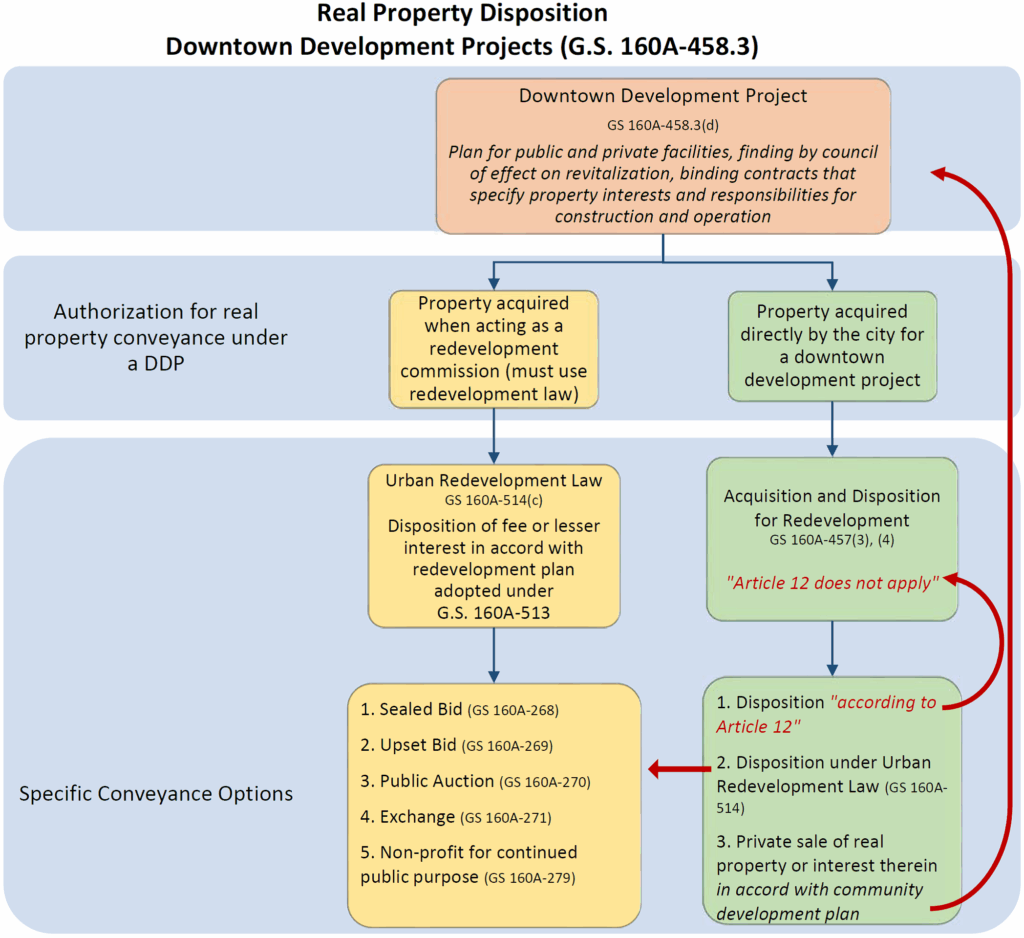- In 1987, the DDP statute was enacted. All of the above disposition powers were authorized “[i]n connection with a downtown development project.” Property acquired under the Urban Redevelopment Law still had to be disposed pursuant to that law’s procedures. For other property acquired by a city, the use of G.S. 160A-457 disposition procedures was authorized but “Article 12 … does not apply to such dispositions.”