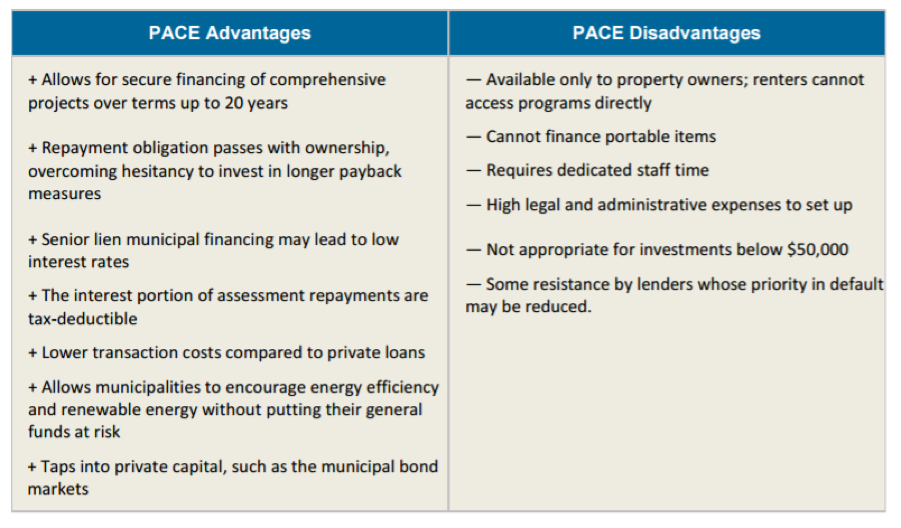 C-PACE programs have financed $322 million in energy efficiency or renewable energy improvements since 2009. Projects covered by C-PACE programs can include agricultural, industrial, multifamily residential (more than four units), retail and warehouses. The Energy Department has issued guidelines outlining the thirteen-step process for local governments to implement a C-PACE program, in addition to a table describing the advantages and disadvantages (see below). Programs can be managed by different entities. For example, Connecticut’s legislature founded a “Green Bank” to manage its C-PACE program (and other clean energy programs), while Texas’ program is managed by a non-profit organization.