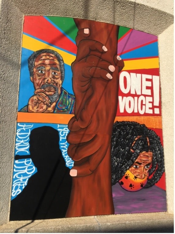 "One Voice" panel from the "Adkin High School Walkout" mural series. Panel created by Maximillian Mozingo.