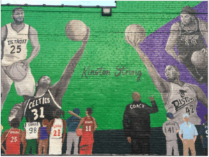 The other two murals with a historic theme were the murals representing Kinston’s obvious community assets–professional athletes and music educators. In both cases, the Committee facilitated “Artist-Community Conversations” which included 2-3 Selection Committee members who were passionate about the mural and 2-3 citizens with specific knowledge or interest in the topic; for example, the athletics mural included the former Parks and Recreation Director who had been part of youth athletics in Kinston for decades, as well as a former coach of high school basketball who had written a book collecting the names and accomplishments of Kinston’s professional athletes.