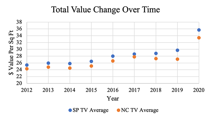 In order to find out whether the findings in the articles mentioned above are generalizable to the American Southeast, the impacts of upzoning on property values were studied in two municipalities in North Carolina: Cary and Morrisville. Both municipalities are wealthier, suburban, non-college towns located in the heart of the triangle region. Time-series data from 2013-2020 was gathered from Wake County itself (in North Carolina, counties are primarily responsible for property value assessments, and while state law mandates the county evaluate a minimum of every eight years, Wake County evaluates every four years. The study therefore encompassed three reevaluation periods: 2012, 2016, and 2020). The study compared the changes in average price-per-square-foot of residences bordering upzoning cases from 2012 and 2013 against their neighbors, whose property lines did not directly border those of an upzoning case. In total, the study encompassed 361 properties surrounding upzoning cases and 310 of their randomly-selected neighbors.