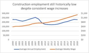 Labor shortages are not new to the construction industry, but the pandemic has added fuel to an already urgent issue. With an aging workforce vulnerable to economic shocks, the construction industry has seen sharp rises and falls in the last 20 years, increasing safety and quality concerns. Since 2000, North Carolina has seen a decline in total construction employees, despite steady increases in average weekly wages (shown in the table below). The pandemic stalled employment growth and demand temporarily, but recently demand has been rising again, especially in new residential development and rehabilitation, with many North Carolina construction businesses looking to hire multiple new employees.