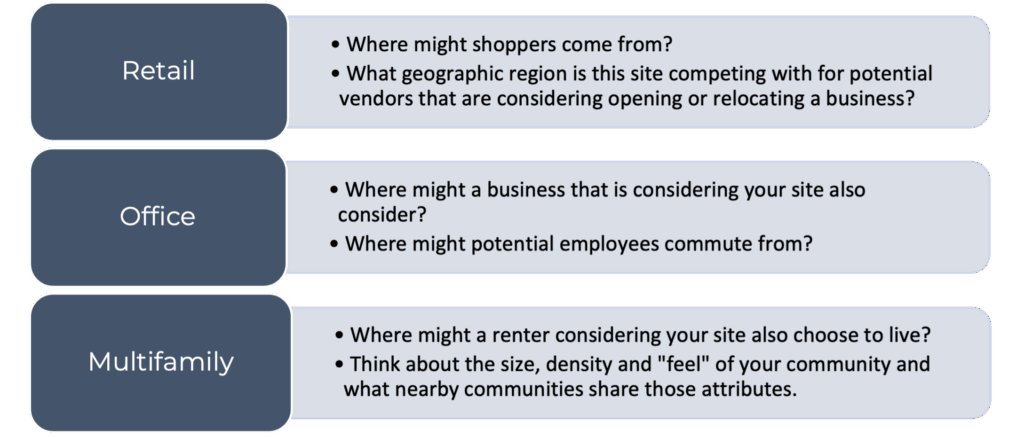 - Competing markets – While any site is likely to have nearby comparable properties that may compete, it is important to understand when existing retail, office or residential nodes command their own market area. Existing commercial nodes may serve as anchor centers that draw their own radius of consumers. A small-scale downtown-oriented site may not be able to draw shoppers that are near an existing town center development. These existing nodes and their market and trade areas should be noted and carved out of your site’s trade and market areas.