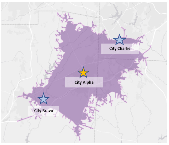 Consider the map below, which illustrates a 15-minute drive-time radius from Alpha City (in purple). While potential shoppers may be willing to travel 15 minutes to access retail opportunities, this 15-minute drive-time includes parts of Bravo City and Charlie City which have their own retail shopping nodes. The Alpha retail trade area should reflect these competing markets.