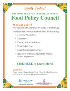 One successful example is the Cumberland Food Policy Council, whose mission is “to provide a forum for representatives involved in all aspects of the local food system to foster effective policies, programs, and community collaboration that decrease food insecurity and increase access to healthy foods within Fort Bragg and Cumberland County.” In the details around the FPC’s history and initiatives, there is clear emphasis on community participation and support as the local priority, and the effort has received significant grant funding. In fact, in 2021, Fort Bragg and Cumberland County founded the first joint County-Military Food Policy Council in the nation.