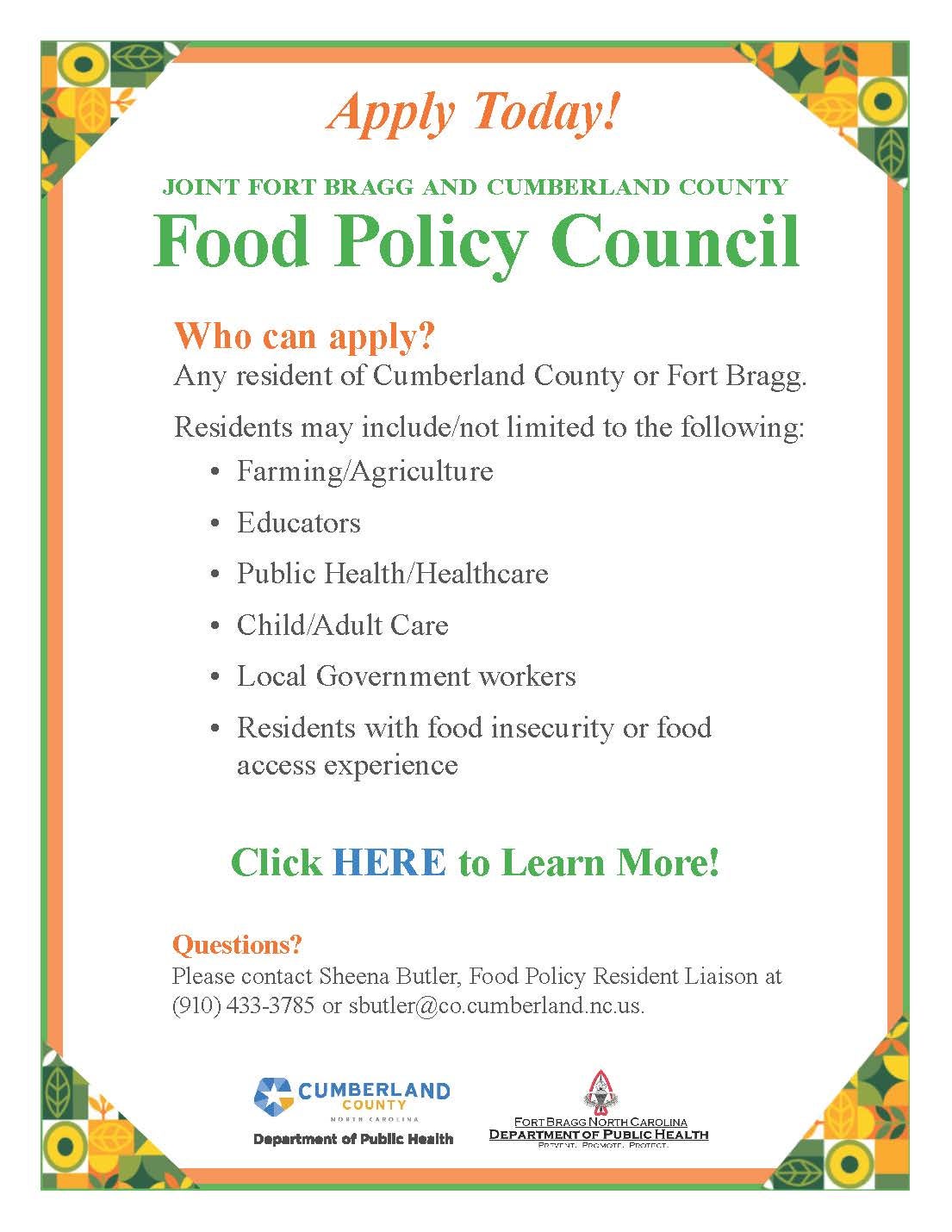 One successful example is the Cumberland Food Policy Council, whose mission is “to provide a forum for representatives involved in all aspects of the local food system to foster effective policies, programs, and community collaboration that decrease food insecurity and increase access to healthy foods within Fort Bragg and Cumberland County.” In the details around the FPC’s history and initiatives, there is clear emphasis on community participation and support as the local priority, and the effort has received significant grant funding. In fact, in 2021, Fort Bragg and Cumberland County founded the first joint County-Military Food Policy Council in the nation.