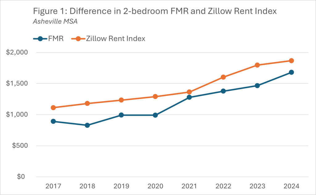 The implications of this difference are shown in Figure 1, which compares the Fair Market Rent and Zillow’s Rent Index for the Asheville, North Carolina MSA. Unlike FMR, Zillow’s rent estimates are based on changes in asking rents. In 2023, for instance, a voucher holder could rent a unit that costs up to $1,450 a month, while the median cost of rental units being advertised on the market was nearly $1,800 according to Zillow. In years when the gap between those two values is large, landlords may be less incentivized to rent their unit to a voucher holder when they could rent out that unit at a higher price.