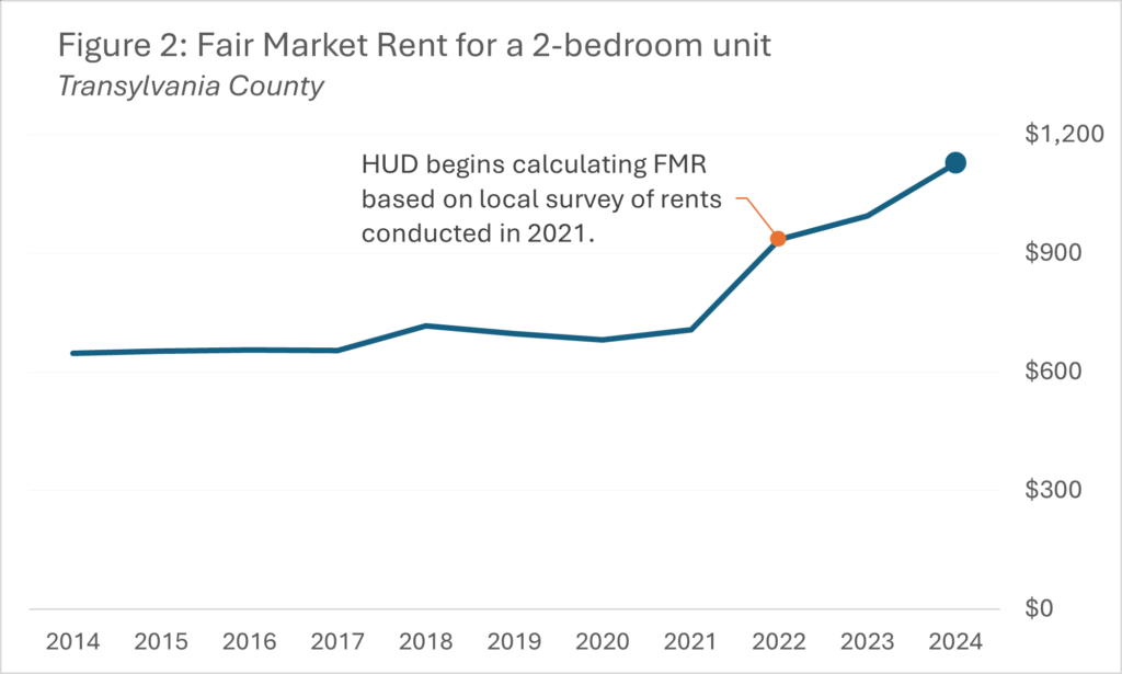 For example, Figure 2 shows changes in FMR for a 2-bedroom unit in Transylvania County, North Carolina. FMR fluctuated between $650 and $700 a month, before jumping 32% in 2022. That year HUD began calculating FMR based on rent data collected and submitted by the local housing authority, rather than the lagged data that was available in the ACS. While it’s possible that rents did increase in Transylvania over that year, the jump that year is likely due to these changes in how the data was collected. This example – in addition to the methodology changes mentioned above – shows how improved data collection can help extremely low-income renters have better access to housing options in their communities.
