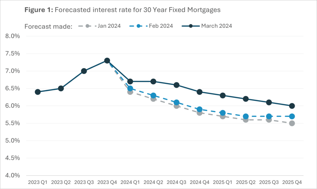 Towards the end of 2023, some market watchers were cautiously optimistic that the Federal Reserve would begin to cut interest rates in 2024. However, stronger than expected inflation data has shifted those expectations over the past few months. In January, Fannie Mae forecasted that the interest rate on 30-Year Fixed Mortgages would drop below 6% by the end of 2024. But in their most recent forecast, Fannie Mae now expects interest rates to remain above 6% through the end of 2025. (Figure 1)