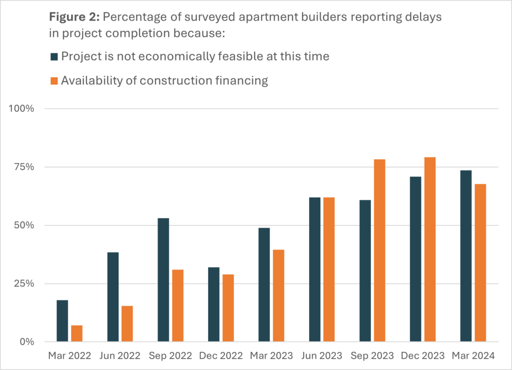 According to one survey of the nation’s 30 leading apartment developers conducted by the National Multifamily Housing Council, 79% of those surveyed reported delays in starts for new projects.[1] Of those delays, 74% were because the project was not economically feasible in March 2024. For instance, Kane Realty – a commercial real estate development company – reported in December that future progress on the mixed-use “Downtown South” project in Raleigh is contingent on “interest rates going down”.