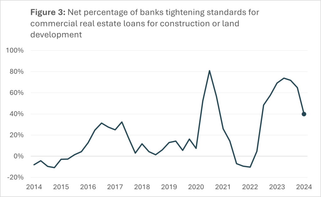 This trend is supported by other data showing that banks are beginning to loosen credit standards, making it easier for developers to borrow for new construction. Figure 3 shows survey response data from the Federal Reserve’s Senior Loan Officer Opinion Survey (or SLOOS). The survey asks banks whether they are tightening standards for commercial real estate loans used for construction or land development.