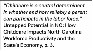ays, but when considered specifically in an economic development context, it impacts local businesses through workforce availability. On Monday, the U.S. Chamber of Commerce Foundation, in partnership with the NC Chamber Foundation and NC Child released a data and analysis heavy report, Untapped Potential in NC, on the economic impact of barriers to childcare provision to North Carolina businesses. When workers are not able to find accessible, affordable childcare options, the authors found caregivers may have to withdraw from the active workforce, costing North Carolina an estimated $5.65 billion in lost economic activity annually. This figure is based on costs due to absenteeism and employee turnover and lost tax dollars from unearned wages related to barriers to childcare, with a clear description of the underlying assumptions in the report’s economic impact methodology appendix.