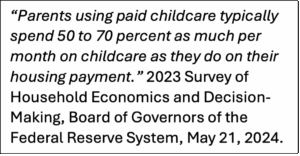 The issue is not going away. There will be more focus on the impact of childcare in the future. The Federal Reserve Board’s Survey of Household Economics and Decision-making now includes childcare questions. Results from the 2023 survey published this past May show childcare costs can make up a substantial share of the family budget, as highlighted in a short Federal Reserve Bank video. Childcare will be a key part of the CED picture going forward at all levels.