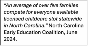 The immediacy of this issue for CED professionals is being driven in part due to upcoming changes in federal funding support for childcare. From 2019-present, the country saw large increases in general funding for the federal Child Care and Development Fund (via the Child Care Development Block Grant), and several rounds of additional funding for childcare in direct response to the COVID pandemic. These funds, estimated at over $52 billion, supported local childcare infrastructure with support for staffing, lower costs to families and organizational stability, providing support of childcare providers and over 300,000 additional childcare placements. The funds tied specifically to COVID response, however, were one-time allocations, and all related funds must be liquidated (actually paid to a provider) by September 30, 2024 – a looming deadline. There also may be related limitations on use of non-COVID child care funding (see Congressional Research Service, What is the Child Care Funding Cliff?). All in all, support for childcare centers across North Carolina may be challenged by the changes in available support in the coming months. It an issue impacting almost every community in North Carolina.