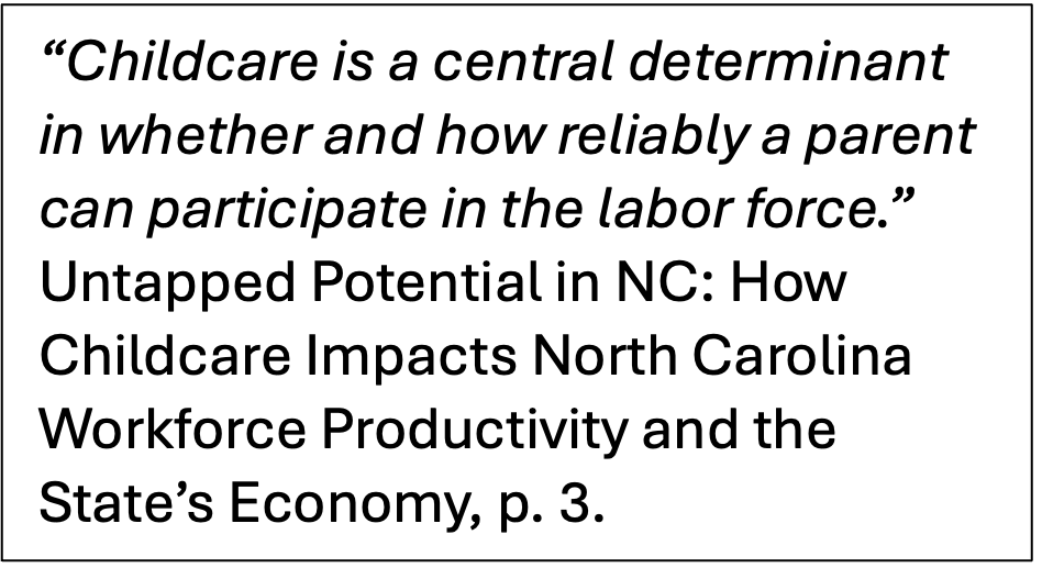 ays, but when considered specifically in an economic development context, it impacts local businesses through workforce availability. On Monday, the U.S. Chamber of Commerce Foundation, in partnership with the NC Chamber Foundation and NC Child released a data and analysis heavy report, Untapped Potential in NC, on the economic impact of barriers to childcare provision to North Carolina businesses. When workers are not able to find accessible, affordable childcare options, the authors found caregivers may have to withdraw from the active workforce, costing North Carolina an estimated $5.65 billion in lost economic activity annually. This figure is based on costs due to absenteeism and employee turnover and lost tax dollars from unearned wages related to barriers to childcare, with a clear description of the underlying assumptions in the report’s economic impact methodology appendix.