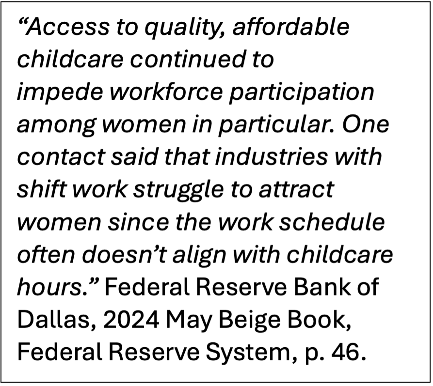 bor shortages in the Labor Market section of each Bank’s report or from the perspective of workers reporting they are unable to actively join the labor force in the Community Conditions section. The most recent Beige Book from May 2024 presented a more mixed picture, with housing affordability, and both a slowdown in hiring and increase in job applications taking general precedence in comments from across the regions. However, the Dallas Region Bank again specifically mentioned childcare (see side bar above), and many of the other Banks emphasized a wide variety of local cost and service access barriers continuing to face middle- to low-income families.