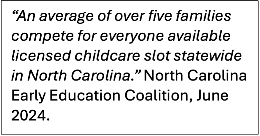 The immediacy of this issue for CED professionals is being driven in part due to upcoming changes in federal funding support for childcare. From 2019-present, the country saw large increases in general funding for the federal Child Care and Development Fund (via the Child Care Development Block Grant), and several rounds of additional funding for childcare in direct response to the COVID pandemic. These funds, estimated at over $52 billion, supported local childcare infrastructure with support for staffing, lower costs to families and organizational stability, providing support of childcare providers and over 300,000 additional childcare placements. The funds tied specifically to COVID response, however, were one-time allocations, and all related funds must be liquidated (actually paid to a provider) by September 30, 2024 – a looming deadline. There also may be related limitations on use of non-COVID child care funding (see Congressional Research Service, What is the Child Care Funding Cliff?). All in all, support for childcare centers across North Carolina may be challenged by the changes in available support in the coming months. It an issue impacting almost every community in North Carolina.