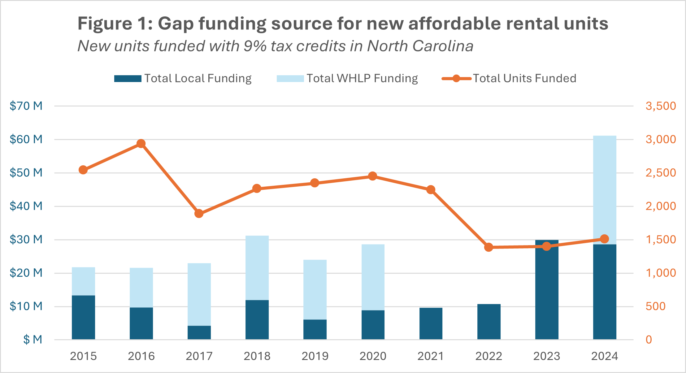 Historically, affordable housing developers have accessed gap funding through a state program called the Workforce Housing Loan Program (WHLP), administered by NCHFA. However, funding for WHLP lapsed from 2021 to 2023, just as construction costs surged. In response, developers increasingly relied on local governments to fill the financial shortfall. Local governments can assist housing projects for low-to-moderate income households when they meet the requirements described by my colleague Tyler Mulligan in blog posts here and here.