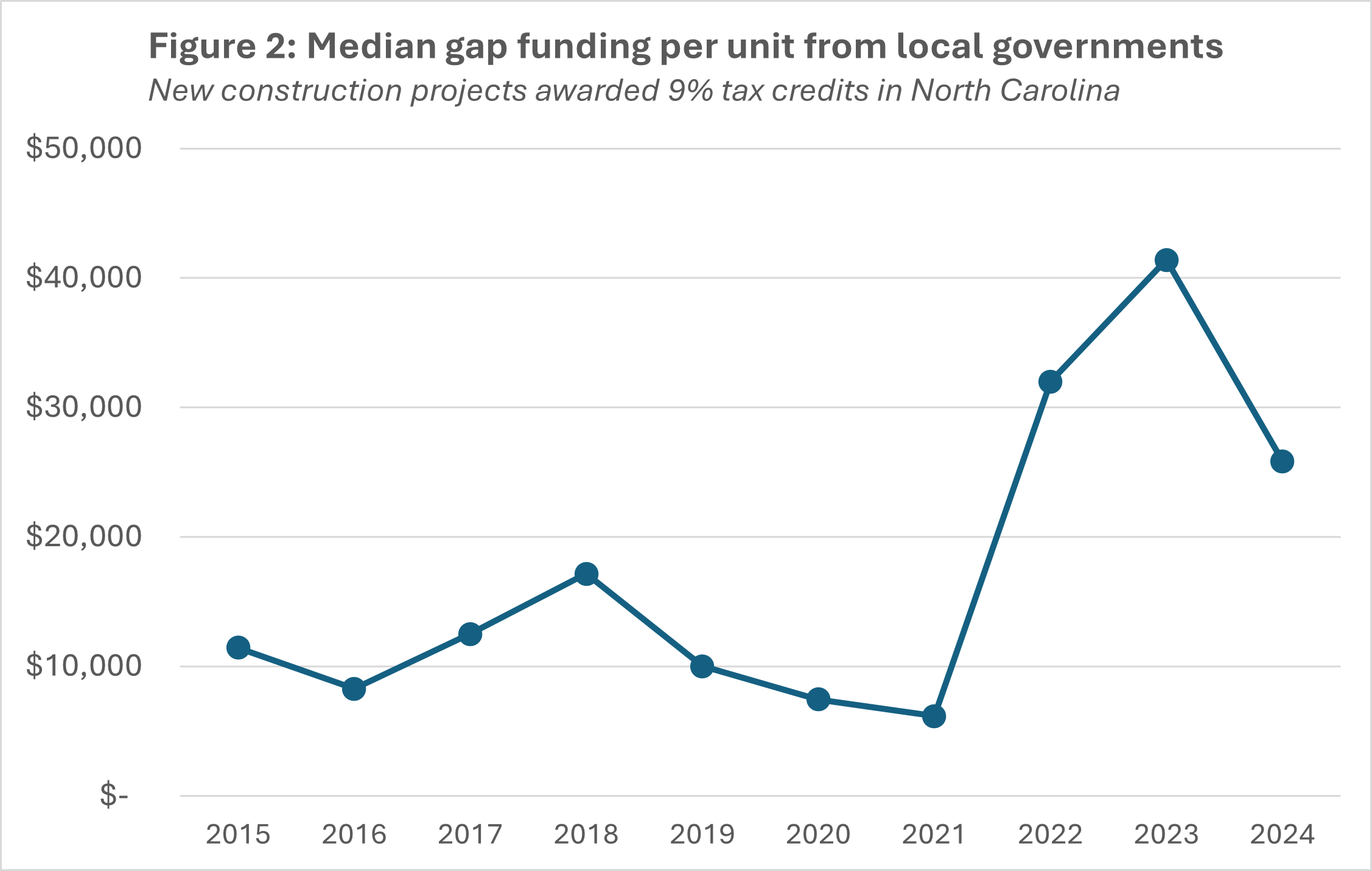 In 2024, the North Carolina General Assembly renewed funding for WHLP, with NCHFA awarding $32.5 million to 88% of new construction projects. However, the return of WHLP funding did not fully alleviate the need for local government support (Figure 1). This year, local governments committed over $28 million to 9% tax credit projects, an amount still well above the historical average of the past decade. Across both sources, gap funding exceeded $60 million.
