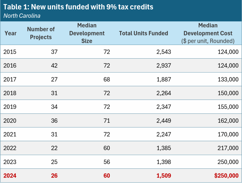[1] Each year, the IRS allocates tax credits based on each state’s population. In 2024, North Carolina was awarded $31.1 million tax credits, a $2 million increase from the previous year because of population growth. In addition to available gap funding, North Carolina also had more tax credits to fund more units. https://www.novoco.com/resource-centers/affordable-housing-tax-credits/2024-federal-lihtc-information-by-state#N