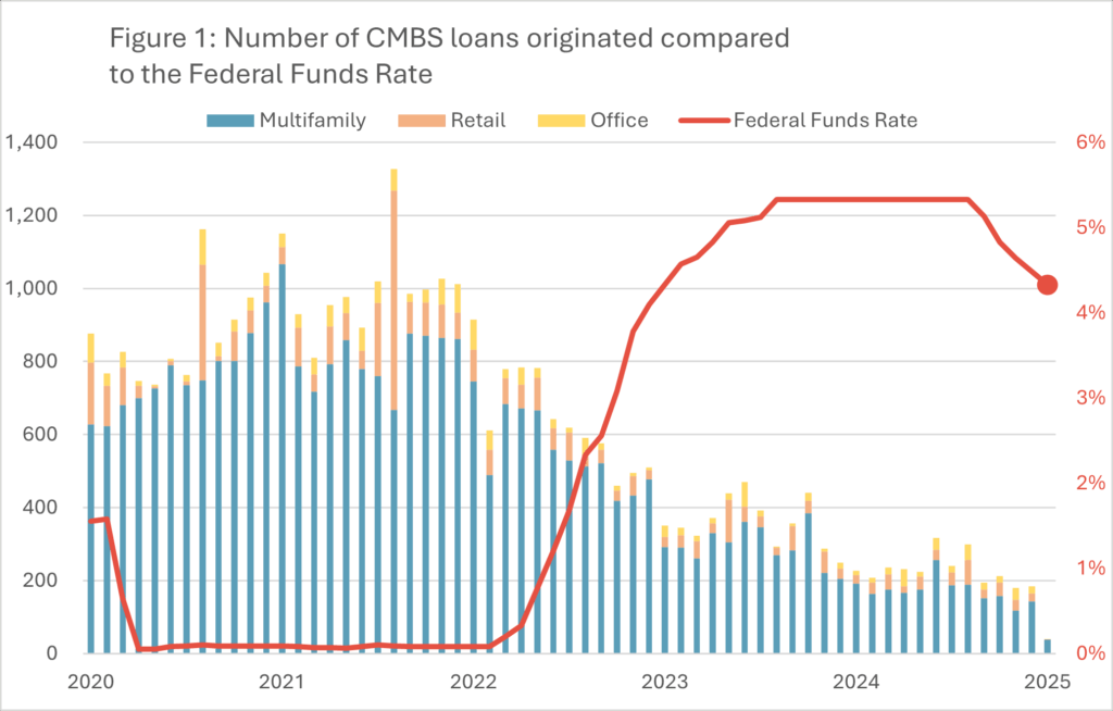 To recap, as inflation rose in 2022, the Federal Reserve voted to increase interest rates after a keeping them at near zero percent in response to the COVID-19 economic crisis. As rates rose, lending for real estate development projects slowed down as projects became more difficult to finance. Even after interest rates were cut again in September 2024, real estate development lending has not returned to pre-2024 levels. (Figure 1)