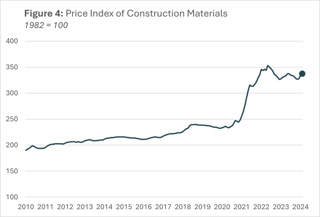 In addition to the availability of lending, the cost of building materials continues to be between 30% and 45% higher than pre-COVID prices. In January 2023, one construction company official told WBTV, “COVID really started really inflating prices for construction, for a lot of different materials and that was really the start of it, and now inflation after that has kept prices kind of high, so it’s been probably about 2-years now.” Even with recent reduced inflation, constructions costs have not declined to pre-COVID levels.[2] (Figure 4)