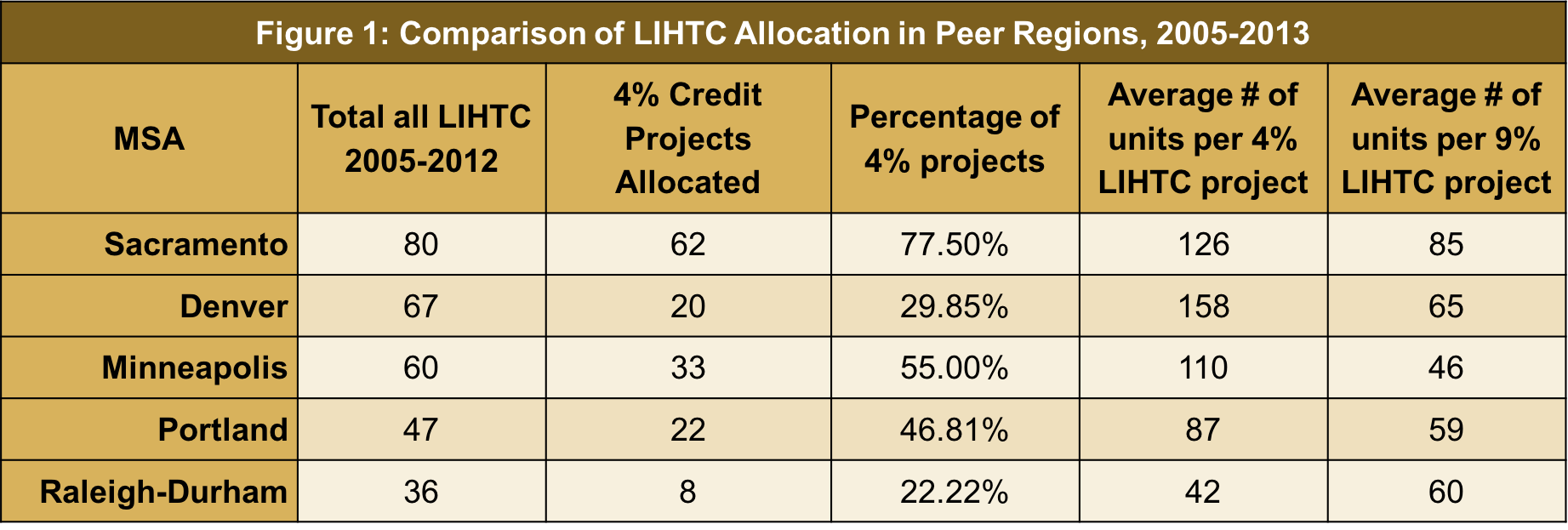 The Research Triangle of North Carolina is a growing region of many local municipalities. As incomes have risen and development pressures rise, however, the tools for affordable housing are increasingly important. Compared to other growing, dynamic peer regions across the country however, use of the 4% LIHTC has lagged in Raleigh-Durham since 2005. Since 2005 in North Carolina, 267 LIHTC projects have been allocated credits, only 46 of which have used 4% credits exclusively. Figure 1 shows the allocation and use of credits in the Triangle region and in peer regions since 2005 to 2013. Compared to peer regions, the Triangle’s LIHTC use has been characterized by: