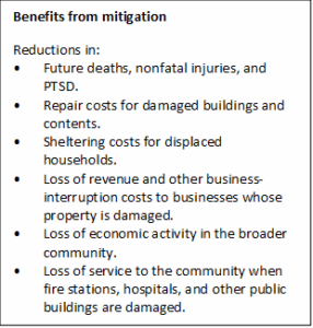 Without delving too deeply into the methodology used, costs include those for the up-front construction and long-term maintenance of improving existing facilities or the additional costs of building new facilities better. They also include health impacts, lost wages, lost business productivity, and pain and suffering. Benefits are the value of the reduction in future losses that mitigation provides. For exceeding existing code provisions, the benefit-cost ratio (BCR) varies from 7:1 ($7 benefit for every dollar invested) for hurricane surge to 4:1 for earthquake and wildland-urban interface fire mitigation. For the impact of federal grants, the range is from 7:1 for riverine flood to 3:1 for earthquake and wildland-urban interface fire mitigation.